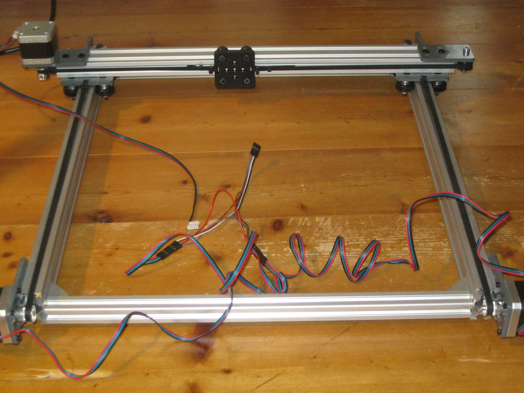 Das Kabelgewirr im Vordergrund ist ein auf die Schnelle hergestelltes serielle Kabel für die Motoren der Y-Achse. Der Grund dafür ist recht einfach erklärt: das Ramps Board kennt nicht die Möglichkeit, einen Motor zu clonen und somit eine Achse mit zwei Motoren zu betreiben. So habe ich mich für die serielle Verschaltung der beiden Nema 17 Motoren an der Y-Achse entschieden.